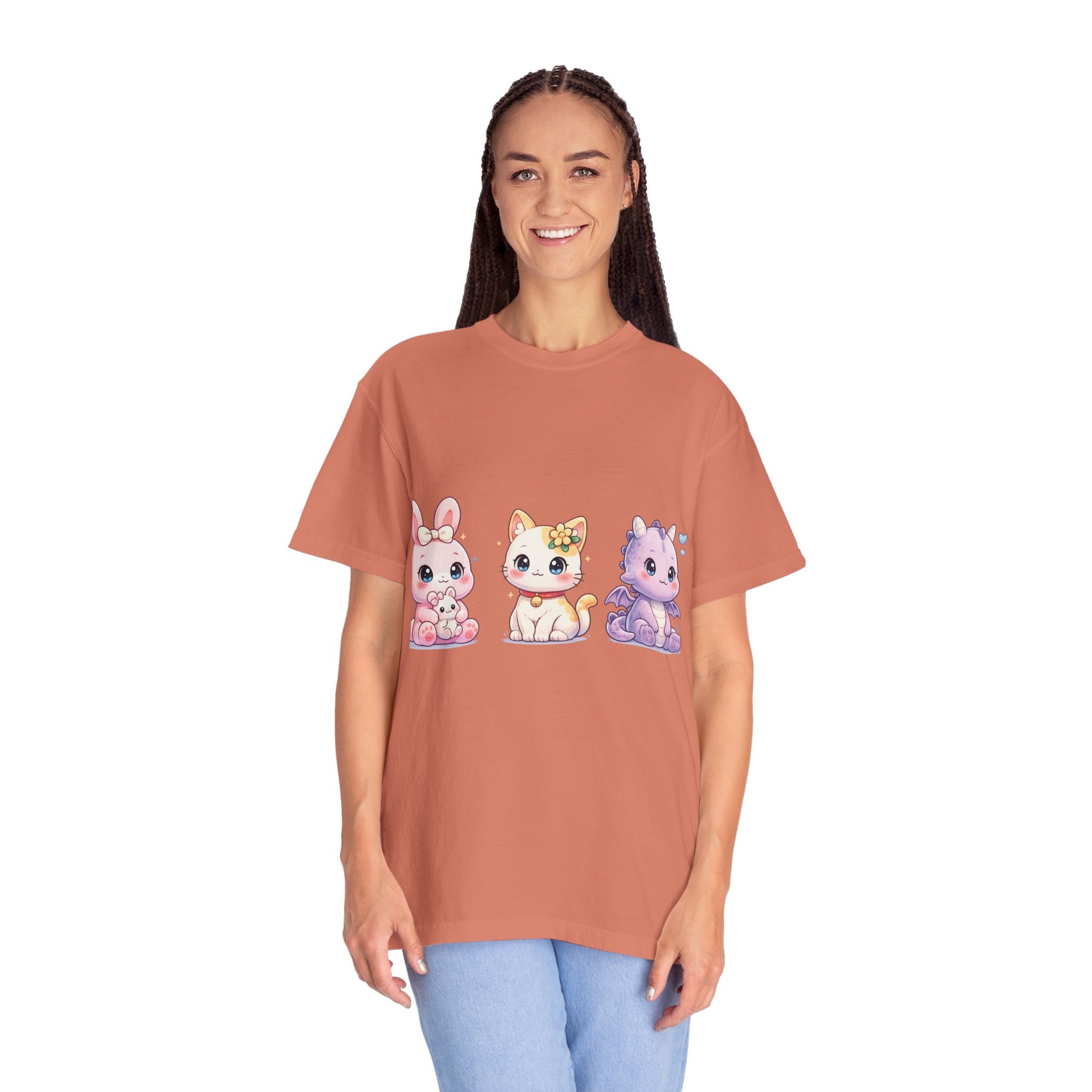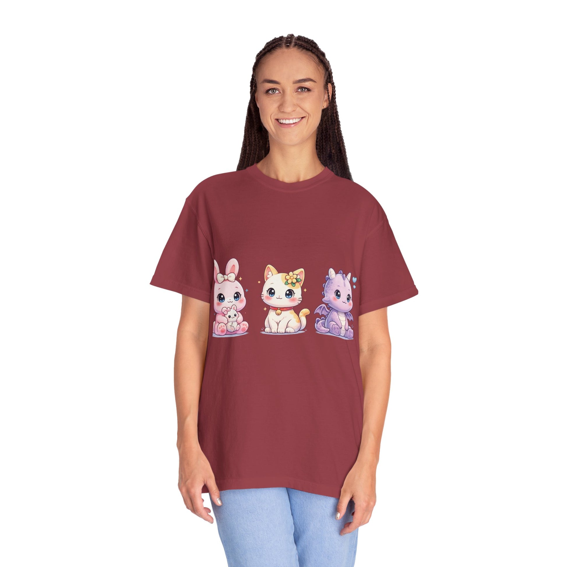 Op de borst zitten drie handgetekende pastelvriendjes — een lief konijntje, een zachtaardige lapjeskat en een dromerig paarse draak — naast elkaar. Elk figuurtje heeft subtiele schaduwen en een licht glanzende, verzamelbare speelgoedlook. De illustratie voelt warm en nostalgisch aan, alsof je een rustige ochtend doorbrengt met je favoriete knuffels verspreid over de vloer.